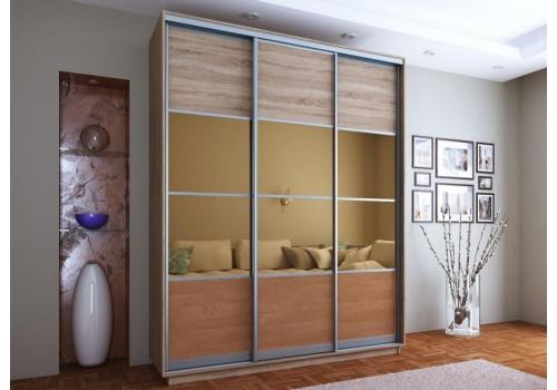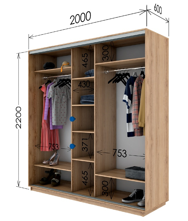 Šatní skříň se zrcadlovými posuvnými dveřmi nabízí praktické a elegantní provedení a hodí se tak do každé ložnice nebo šatny. Systém posuvných dveří usnadní každodenní používání skříně. Korpus i dveře jsou vyrobeny z kvalitní LTD desky. Korpus je v barvě dub sonoma. Horní část dveří je v barvě dub sonoma, spodní část v barvě olše a uprostřed skříň zdobí praktická zrcadla. Nezvyklá výška 220 cm nabídne opravdu dostatek prostoru. Skříň má aluminiové kování a lišty. Vnitřní rozložení nabízí police a šatní tyč viz. obrázek. Dodáváme v demontovaném stavu. Možnost dokoupení praktického bočního regálu nebo zásuvek do vnitřního prostoru skříně (modrá barva na perokresbě naznačuje, kam lze zásuvky umístit), obojí naleznete v naší nabídce.