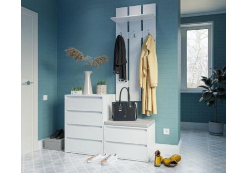Předsíňová stěna vyrobená z kvalitní laminátové desky v barevném provedení bílá (NImfea alba). Sestava se skládá ( š/v/h ) - panel s věšákem ( 60 x 138 x 23,2 cm ), komoda se zásuvkami ( 60 x 80 x 42 cm ) a botník se zásuvkami ( 60 x 40 x 42 cm ). Další rozměry viz perokresba. Sedací polštářek je v ceně (barevné provedení polštářku se od obrázku může lišit). Dodáváme v demontovaném stavu.