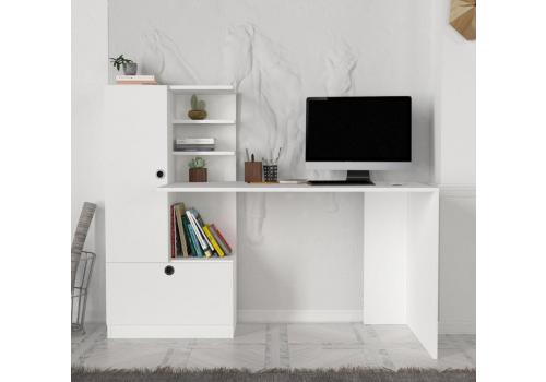 Pracovní stůl s policovým regálem je vyroben z kvalitního lamina o tl.18 mm hraněné PVC páskou, odolného proti poškrábání v barvě matná bílá. Regál disponuje úložným prostorem s dvířky a také dvířky s výklopem ve spodní části. Pracovní plocha stolu je 120 x 62 cm. Výška pracovní desky je 73,6 cm. Dodáváme v demontovaném stavu.